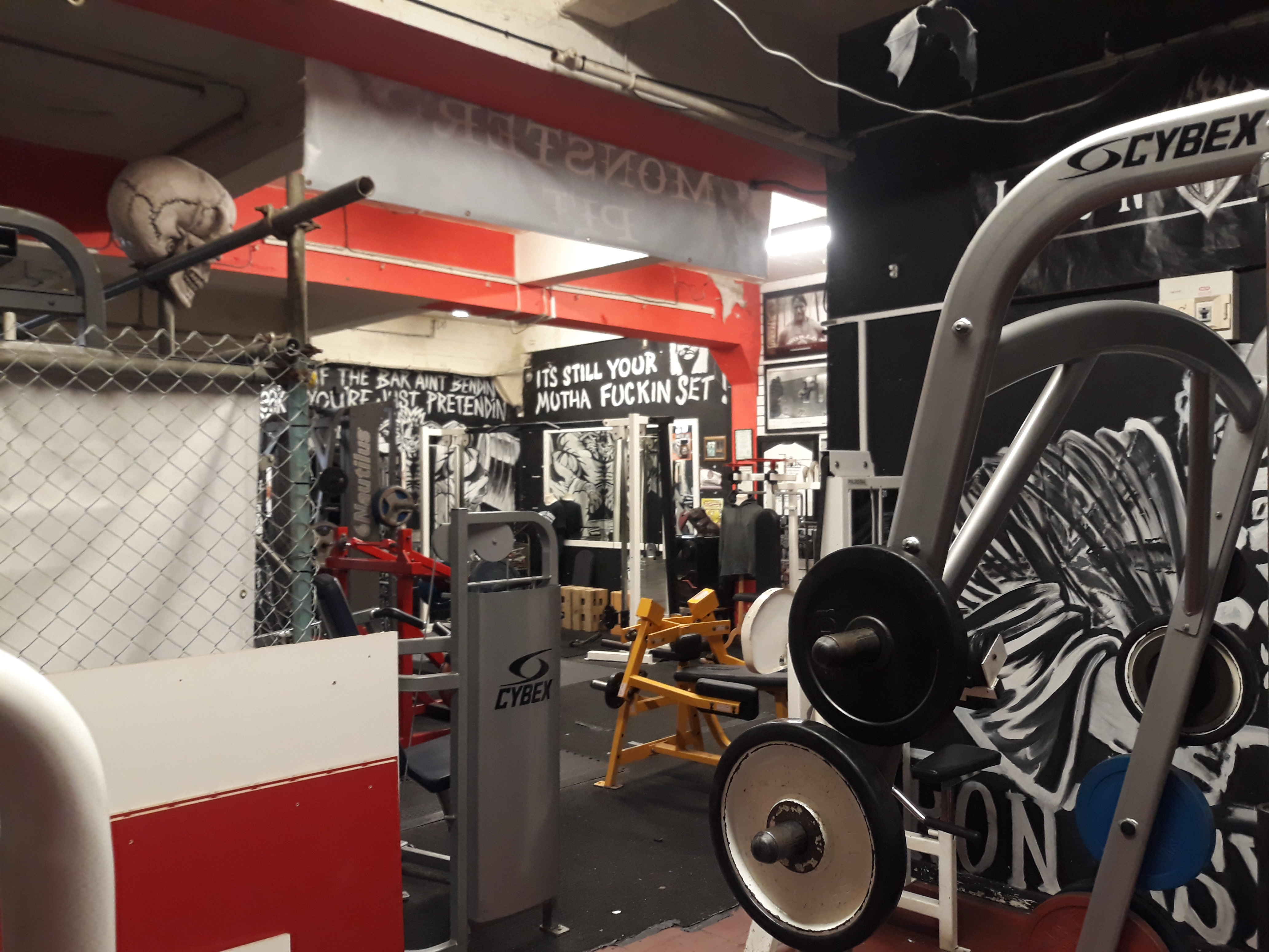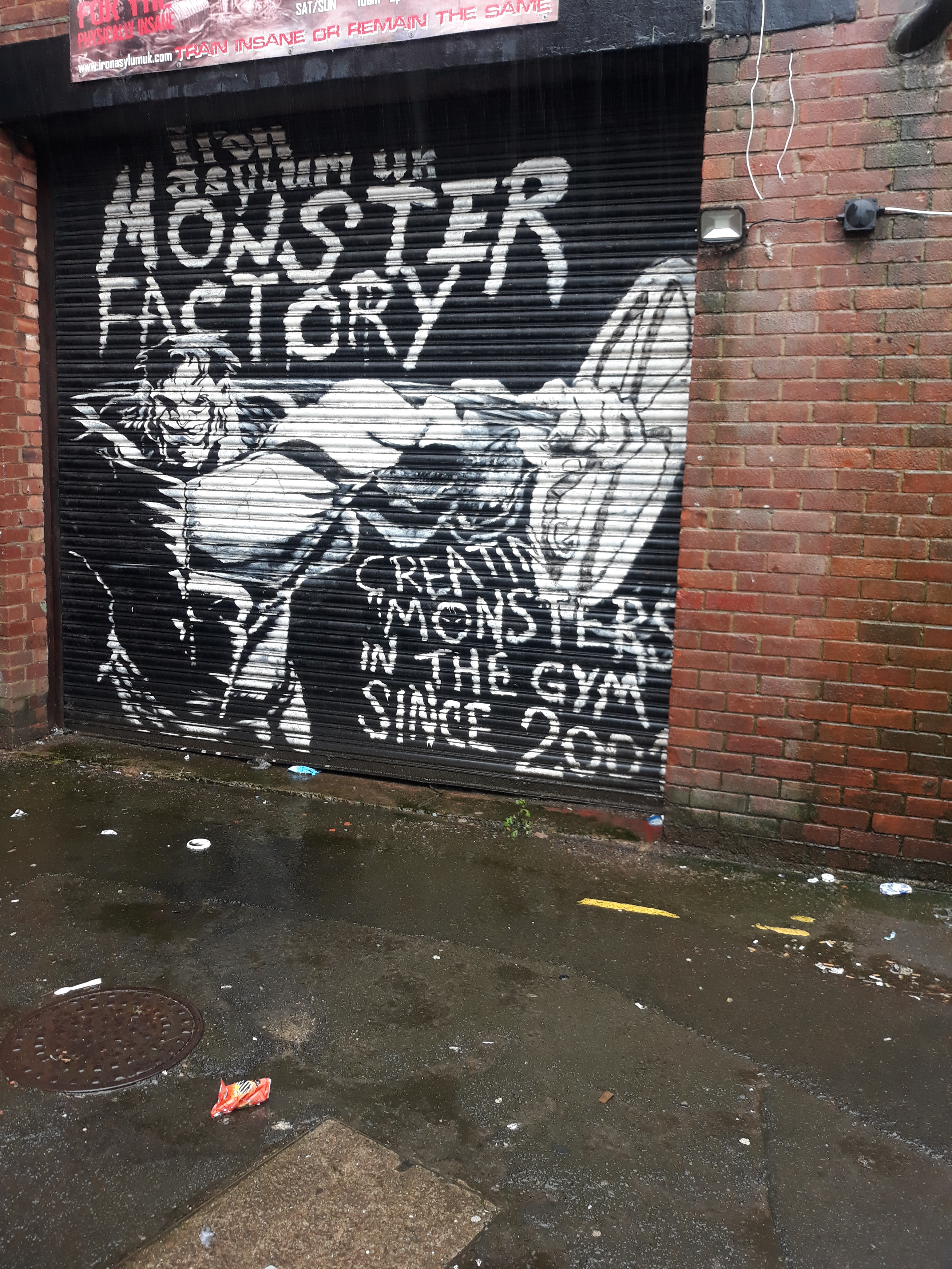 It was a usual British summer day, wet and miserable as I arrived in Redcar. Soaked to the bone I arrived at the Iron Asylum, which is just off a main road and down an alley way. I recall reading a review of how a new member was nervous upon visiting and I was too. The large shutter with Monster Factory and massive muscular character sprayed on in it. Like the guy doing the review I was nervous too. I’ve been to a lot of gyms all varying in what they offer, what they specialise in, but this was probably the first gym I had been to that I had been told was hardcore. If the images on social media didn’t fully tell me this place was hardcore then that shutter hammered it home. I entered through a door to the side of the shutter and when I looked around I was in awe. This gym had that old skool hard as fuck vibe but it was more than a gym, it was like an exhibition of very impressive street art from the brand Monster Factory (more on that later). I was now excited; I walked through the ground floor of the gym and turned left into the shop/office space and met with Mick and Amy who are the Iron Asylum. I don’t know what I expected but Mick and Amy were incredibly welcoming and friendly, as if I had been a member for years. We had a great chat about all things gym related, about the online magazine I am doing and we obviously discussed their gym.