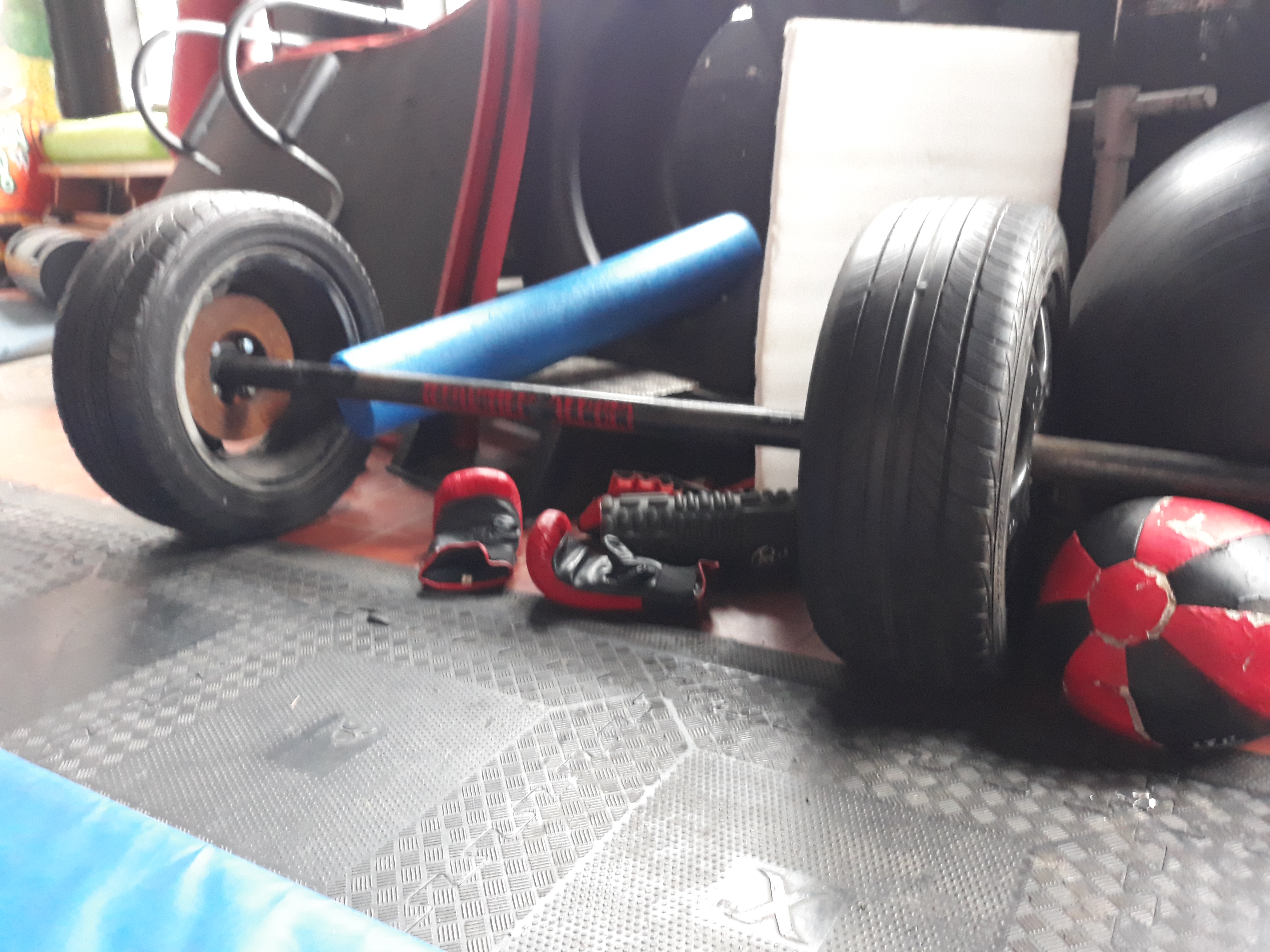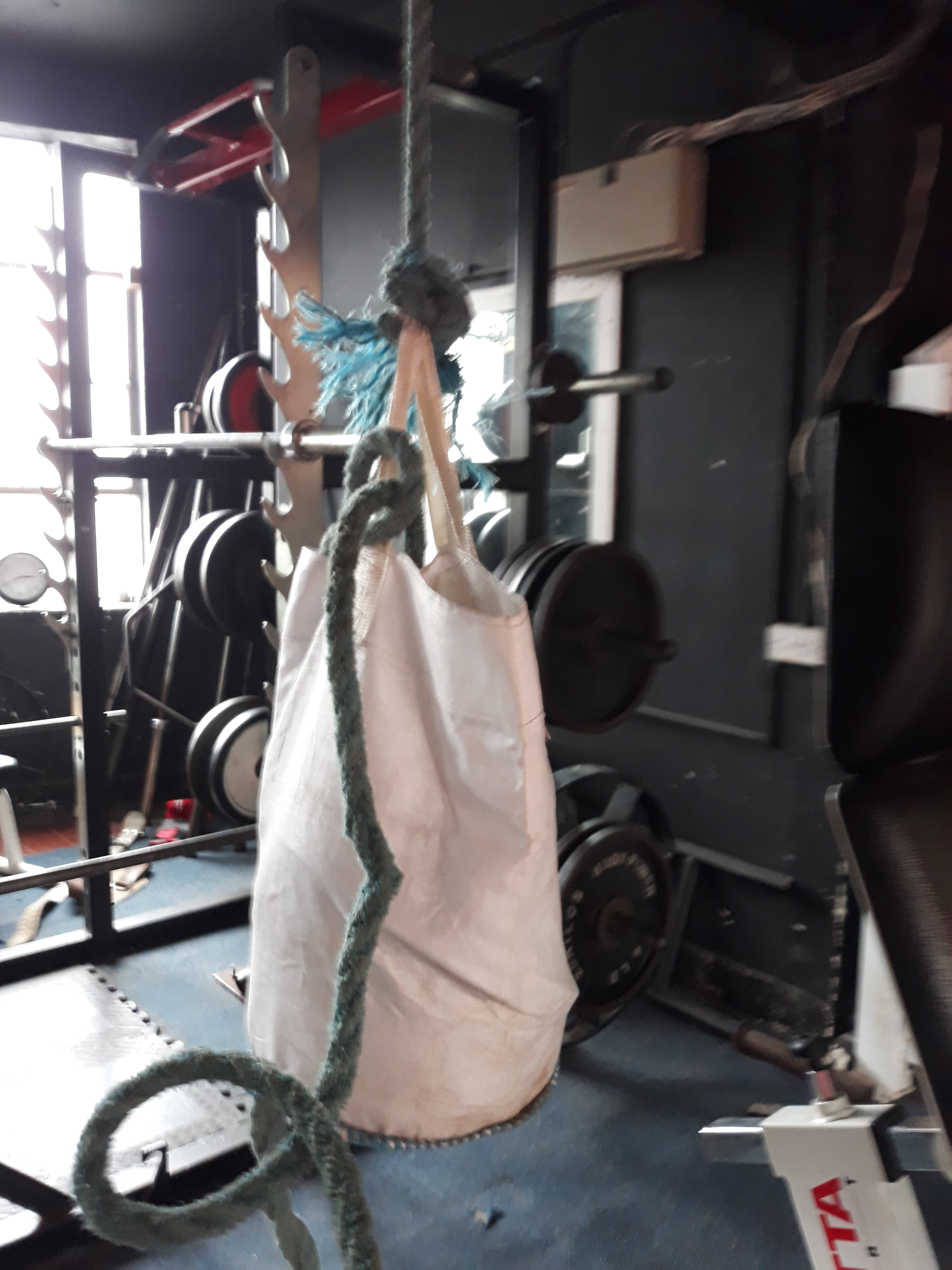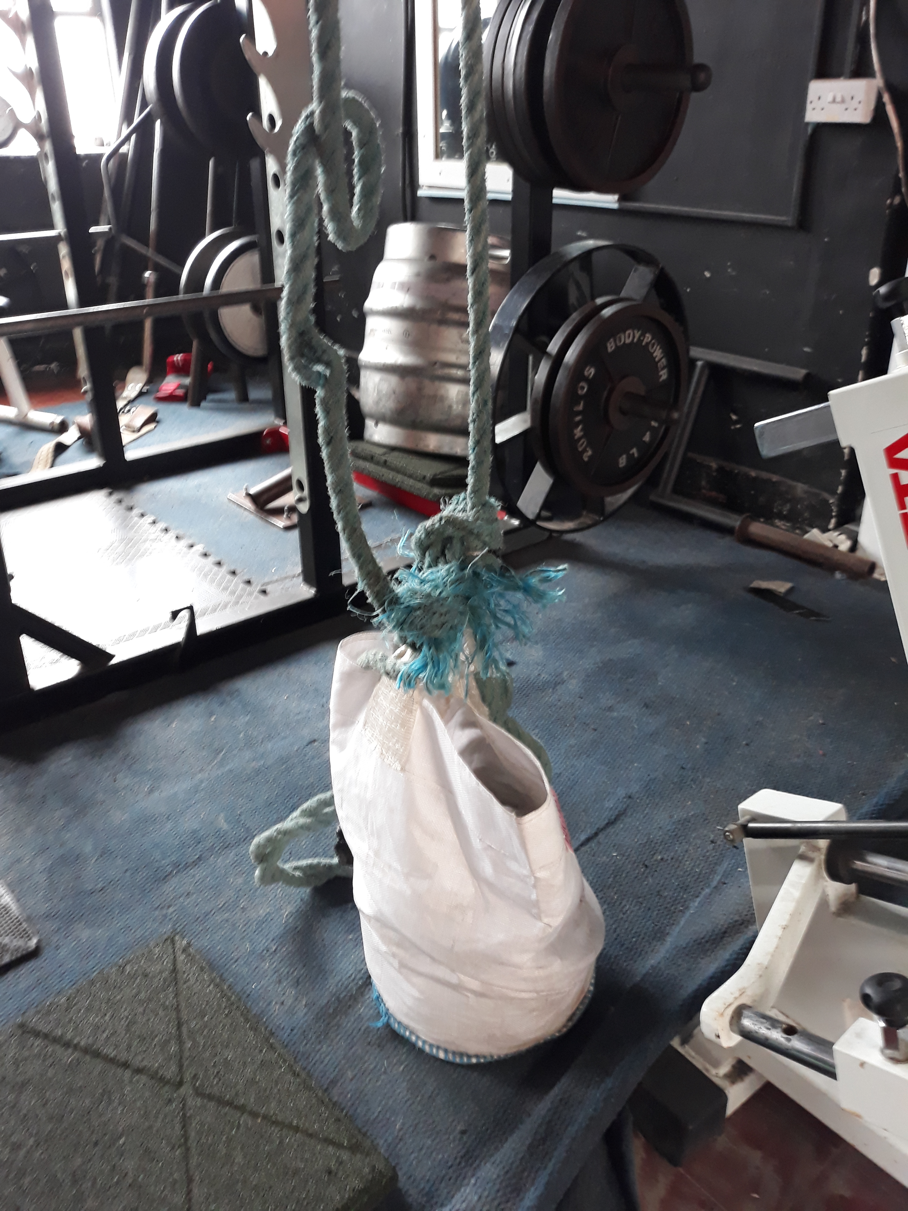 Also upstairs was a deadlift platform and a couple of squat racks but a play area of sorts. I rope attached to a bag that you can load up and pull up down, simple but effective. A bar with big arse tyres on it, wagon wheels, kegs, a training log – it turned out it was a bit of a strongman section. I am definitely taking some of these ideas to the strongman gym I train at.