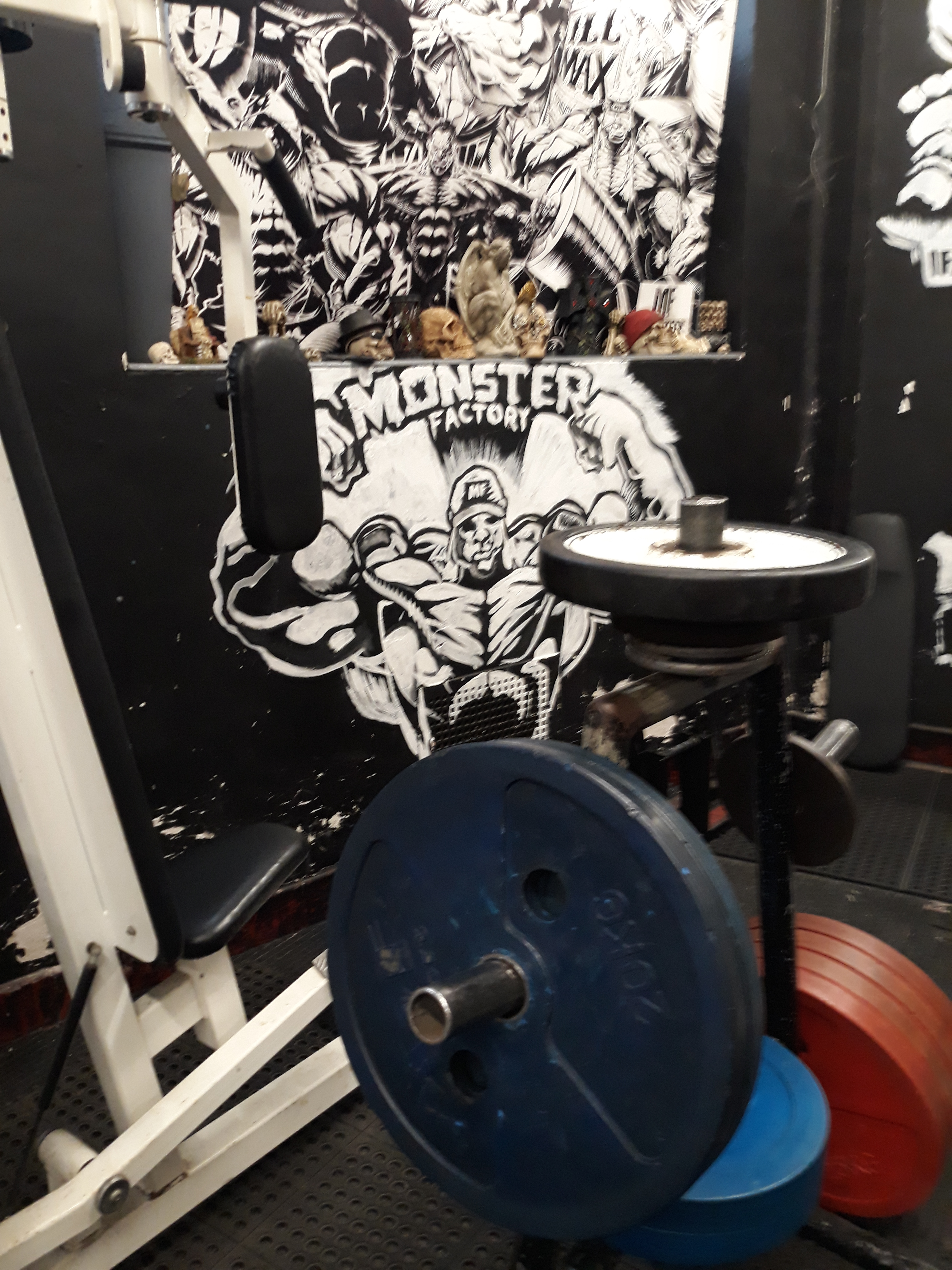 I was warned not be scared of the coffin on the way up, I was thinking I might have needed that if I was doing legs. My eyes were all over the place as I walked through the gym, not just at the heavy ass machines – which don’t match and this is something I agree with for a hardcore gym, Mick had hand selected all the equipment – but also the various art work, there was so much and I’ve littered this review with them. I warmed up and began on a seated cable row made by Savage. My warm up set almost buried me. This was so heavy, I had to put my ego well and truly in my pocket. The same goes for the close grip pull down and machine seated row. Those first three exercises were tough! But with atmosphere in the gym I felt compelled to keep pushing my limits. I done way too much on back as there was so many variants of pull downs and rows hitting all angles and areas of your back. A truly comprehensive section and selection of equipment for any back workout.