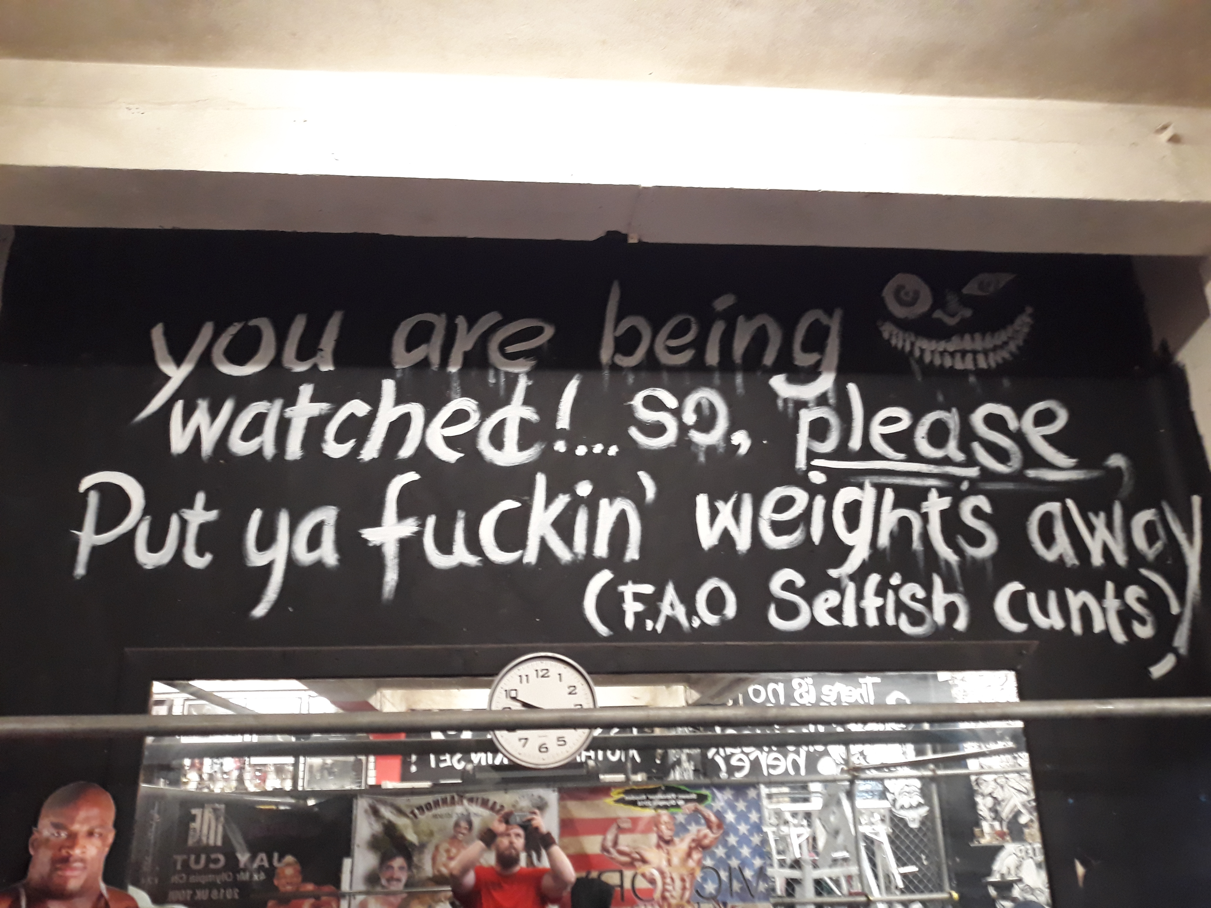 Downstairs there was copious benches, arm machines, chest and shoulders with a free weight area that had a cable that was fenced off and had the feeling of a prison yard. Imagery was all over again. Slogans are also on the walls throughout, but these aren’t the ‘keep going’ softly soft ones, these are littered with profanities. After overdoing it on the back, I also overdone it with the guns. The energy was insane in there. Every set was one more rep and then it was one more set. I definitely chased the pump and beyond. Then I saw this old chain triceps extension machine in the corner. That was heavy, seriously heavy, I could only crank out a couple of reps and I knew I was done.